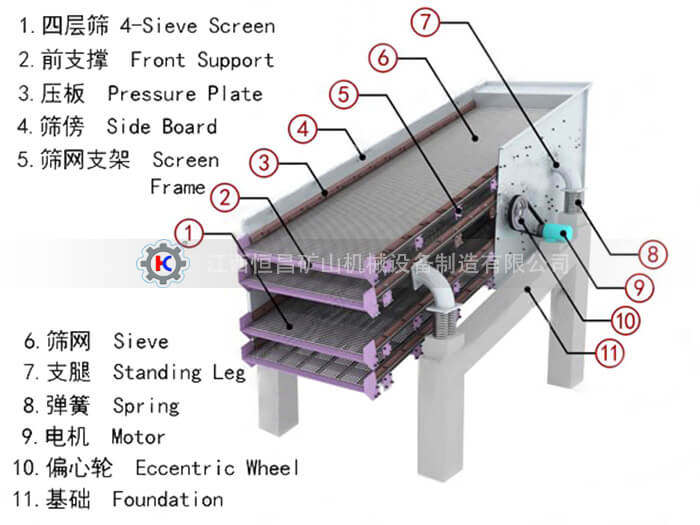 YA型振動(dòng)篩選機(jī)設(shè)備主要由篩箱、篩網(wǎng)、偏心軸、減振彈簧裝置、底架等組成。