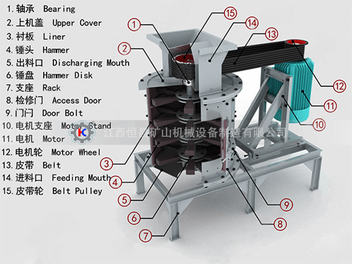 立式制砂機(jī)主要由傳動(dòng)裝置、主軸、筒體、襯板、錘頭、上蓋及底座等部分組成。